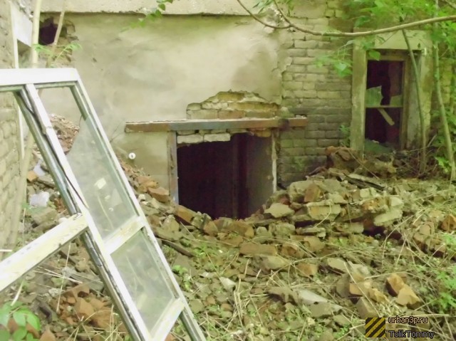 Во внутреннем дворике большое количество кирпичей, оконных рам, балок.