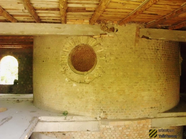 Водонапорная башня же на уровне пола второго этажа, с момента строительства вокруг него здания, имеет бетонное перекрытие. Лестница водонапорной башни частично разобрана. Насосов и приборов нет уже долгое время. У самой водонапорной башни в составе стройки была сделана новая крыша.
