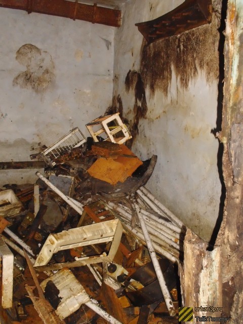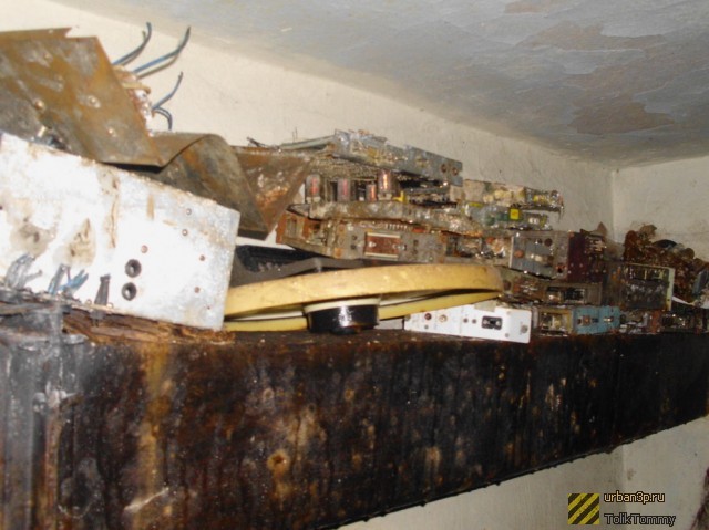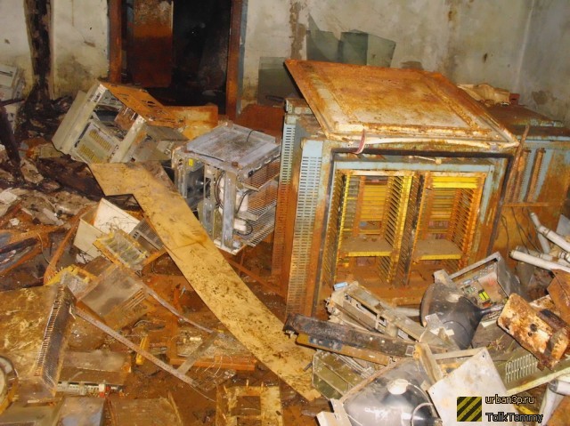 Почти во всех комнатах на полу лежат корпуса от старых ЭВМ и мониторы или просто кинескопы от них, видны платы и разные радиодетали повсеместно.